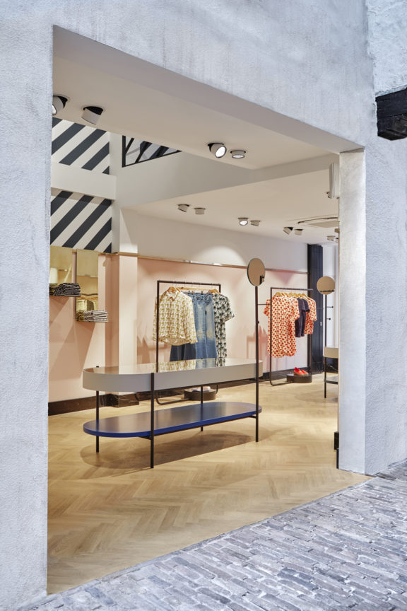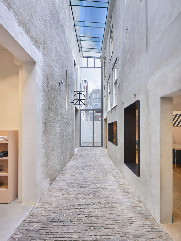 Iconic denim store De Rode Winkel, located in the picturesque city centre of Utrecht, teamed up with design studio VEVS to create a new retail experience, integrating an intersecting historic alley into the store. Now that a glass roof (architectural intervention by Thomas Kemme Architects) has relocated the alley to the inside, a renewed main entrance lures customers into a contemporary world of denim. VEVS’s playful and sophisticated approach of the interior has created distinctive spaces, each one responding to another consumer need.